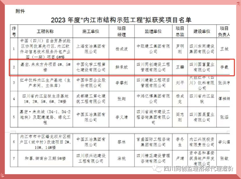 近日,內江市住房和城鄉建設局公布了2023年度內江市“結構示范工程”獲獎工程名單,四川同創建設工程管理有限公司監理的“嘉宏.未來方舟項目4#、5#樓”項目榜上有名,這一榮譽不僅是對項目團隊辛勤付出的肯定,也是對四川同創建管監理工作的高度認可。