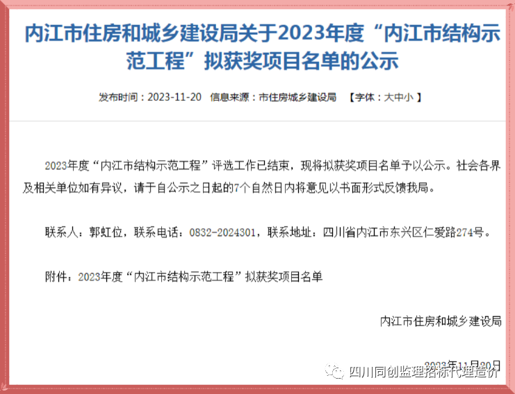 四川同創建管又一項目喜獲2023年度“內江市結構示范工程”!
